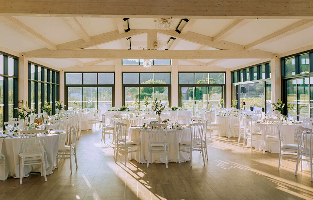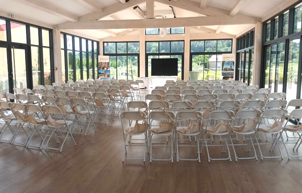 Le lieu est ouvert sur la nature et bénéficie d’une grande luminosité, une large terrasse entoure la salle et permet de recevoir vos invités pour un moment agréable au milieu des vignes.