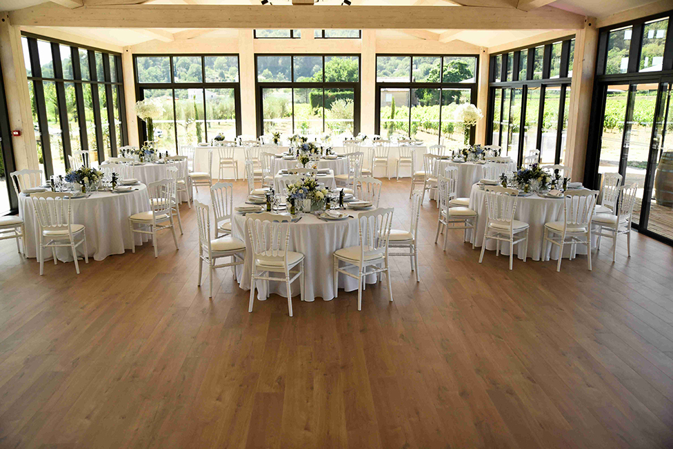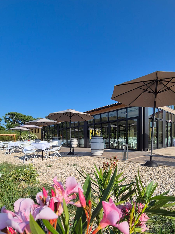 Le lieu est ouvert sur la nature et bénéficie d’une grande luminosité, une large terrasse entoure la salle et permet de recevoir vos invités pour un moment agréable au milieu des vignes.